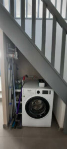 Espace buanderie : lave-linge, table à repasser, fer à repasser, aspirateur Dyson, nécessaires et produits d’entretien.