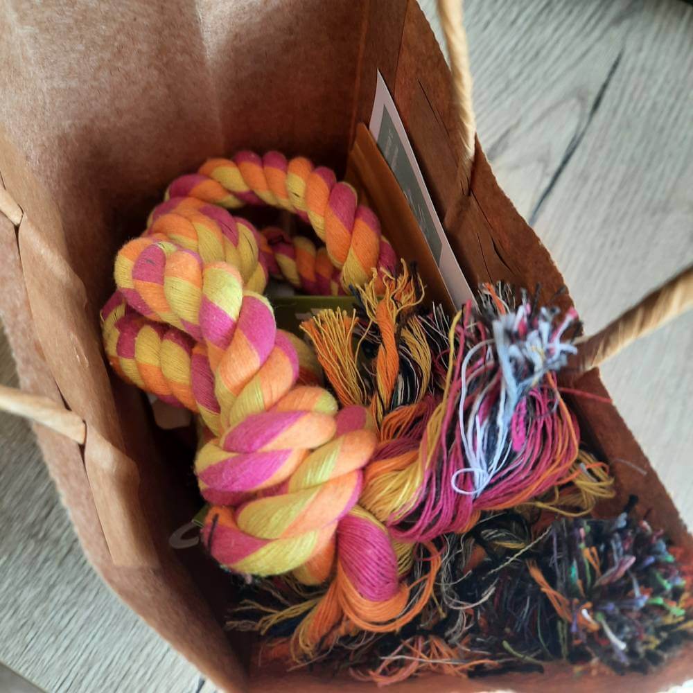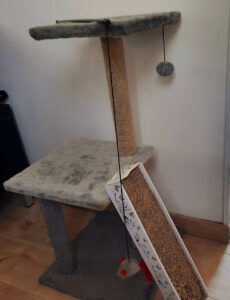Des jouets ( balle, corde, bâtons ), des cartons, un arbre à chat