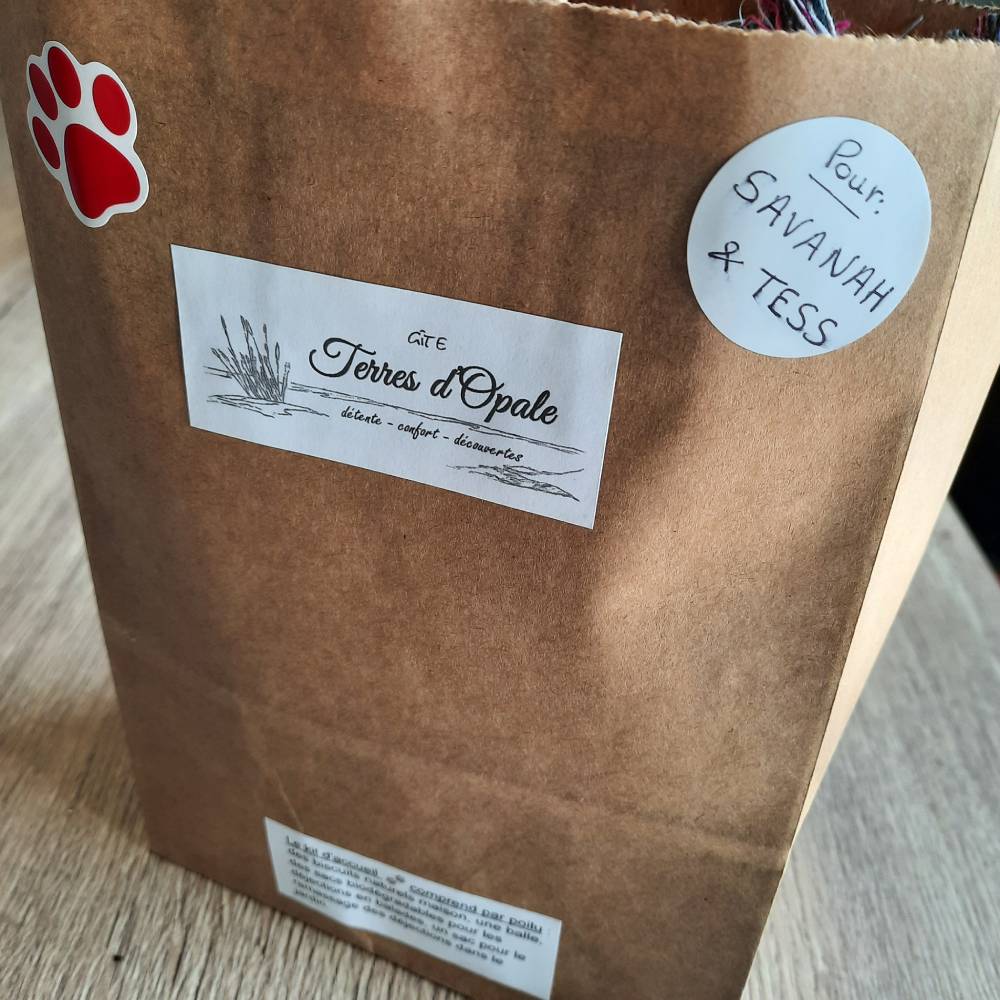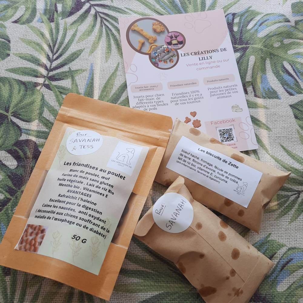 Gamelles, espace pour les barfeurs dans le congélateur, petits biscuits naturels d’accueil.