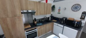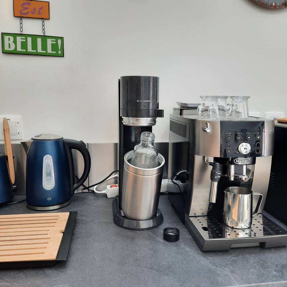 Four, four micro-ondes, réfrigérateur, congélateur, laver-vaisselle, plaque, cafetière broyeuse de grains Delong’hi, cafetière filtre, Sodastream, vaisselle pour 4 personnes, ustensiles de cuisson, petit-électroménager