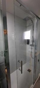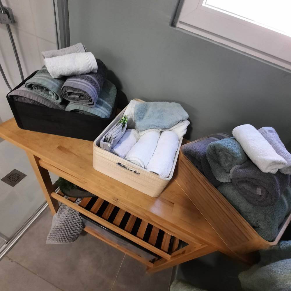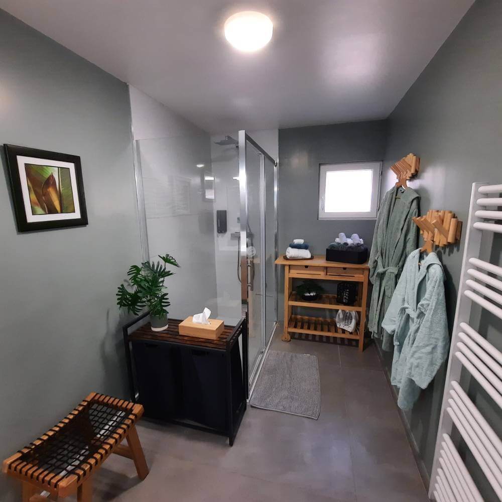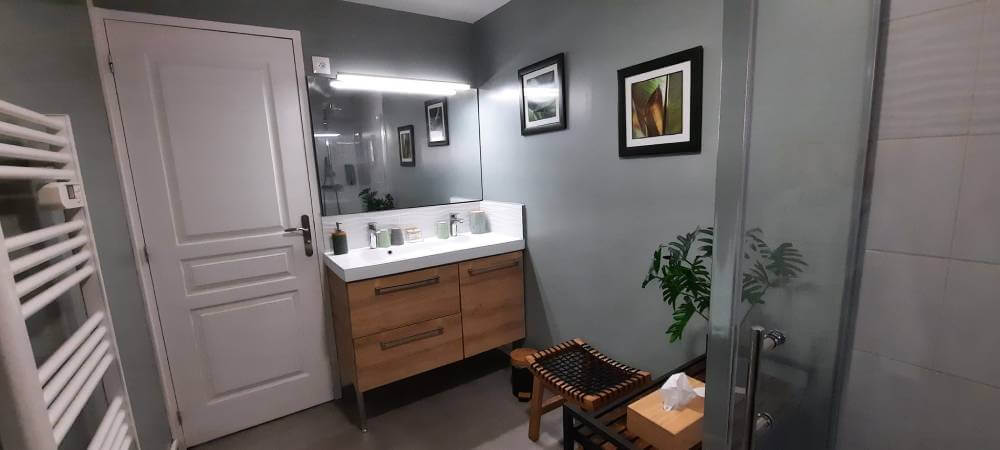 Douche italienne et vasque double, incluant le linge de toilette et les peignoirs, sèche-cheveux, gel douche et shampoing, trousses de secours.